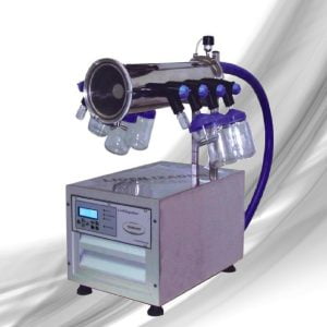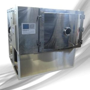 BOMBA DE VÁCUO: de duplo estágio, tipo direct-drive, com velocidade de bombeamento de acordo com o modelo e vácuo final de 10 µHg podendo funcionar com ciclos constantes sem problemas com aquecimento demasiado. Palhetas rotativas banhadas a óleo, dispositivo “gás ballast” para limpeza do óleo e retirada de vapores d’água, além de válvula de retenção de fluxo reverso do óleo, no caso de queda de energia e sensor de vácuo tipo Pirane.
