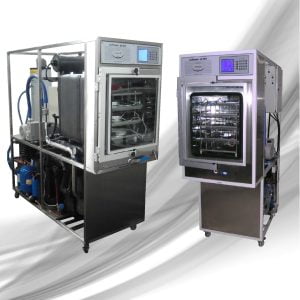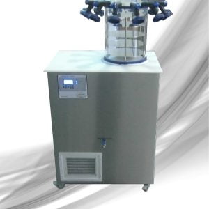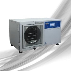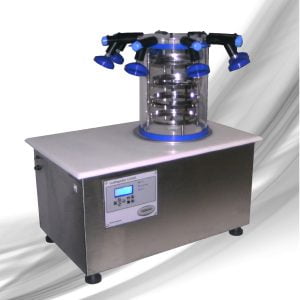 LIOFILIZADOR DE BANCADA: equipamento em aço inoxidável AISI 304, com polimento sanitário espelhado. Sendo o mesmo resfriado até -55ºC por compressor hermético e gás refrigerante livre de CFC. Inclui manifolds/torneiras em borracha nitrílica, com alívio de pressão e comando abrir/fechar, para liofilização em frascos tipo penicilina ou balões expostos ao meio ambiente e ligados diretamente ao condensador. Acompanham adaptadores em borracha de silicone para frascos boca larga (Ø 70 a 80 mm).